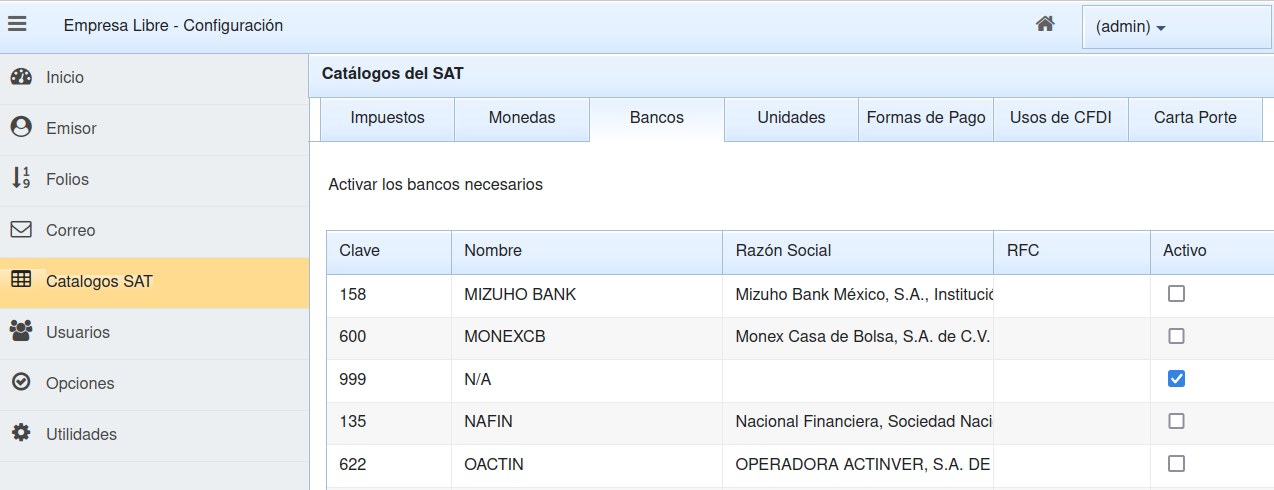 En el mismo menu Catalogos SAT, pero en la ficha Bancos. Marca la casilla de verificación Activo para cada uno de los bancos en donde tengas cuentas bancarias.