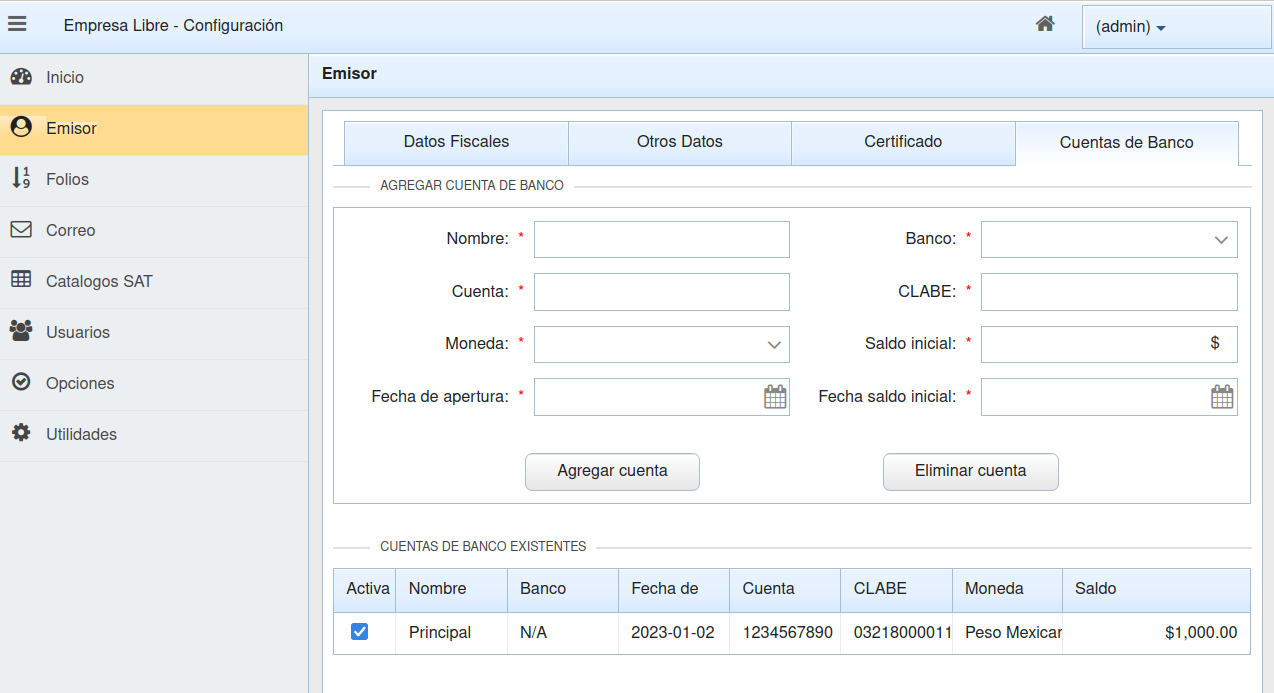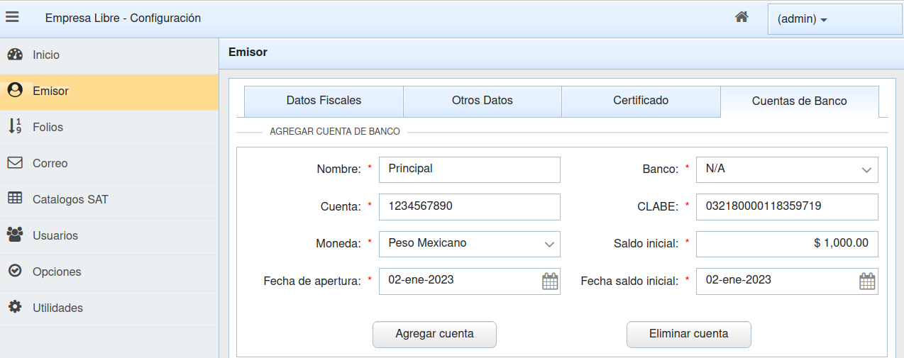 Ve al menú Emisor, ficha Cuentas de banco. Captura todos los datos, todos son requeridos.