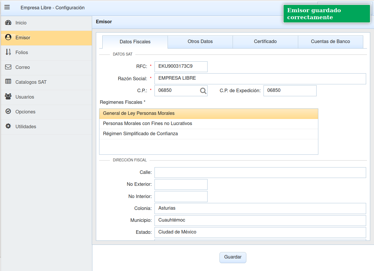 Ve al menu Emisor, ficha Datos Fiscales y llena los datos requeridos: Raz贸n Social, C.P y Regimen Fiscal.