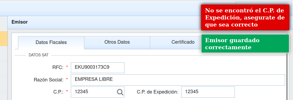 Si el C.P. no se encuentra en la base de datos, puedes obtener un mensaje de advertencia, no obstante, si estas seguro que es correcto, puedes guardarlo sin problemas.
