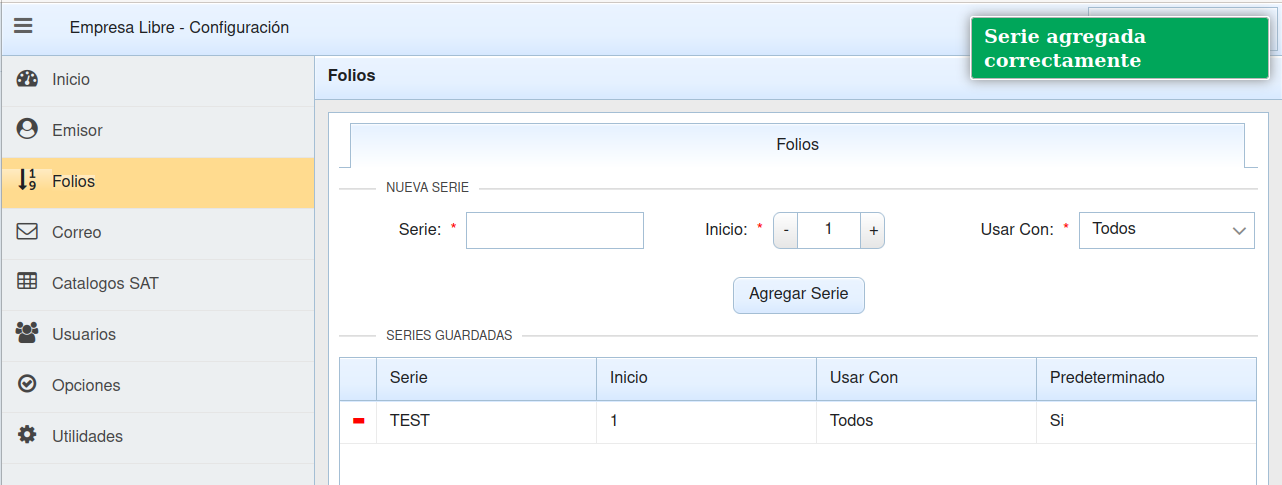 Ve al menu Folios y agrega al menos una Serie. Puedes seleccionar el folio inicial de la misma, as铆 como determinar con que tipo de CFDI los quieres usar.