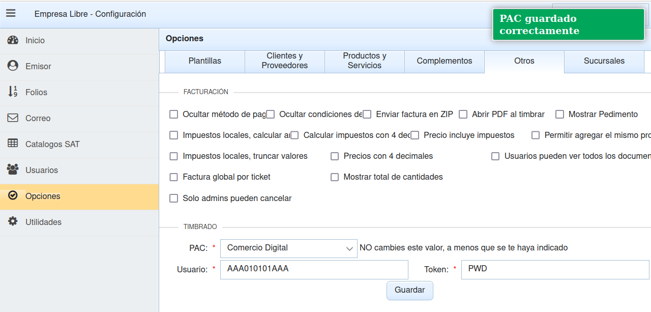 Es necesario configures las credenciales del PAC que se te ha asignado, ve al men煤 Opciones, ficha Otros. En el cuadro de lista PAC selecciona el PAC que se te haya asignado, as铆 como los valores de los campos Usuario y Token