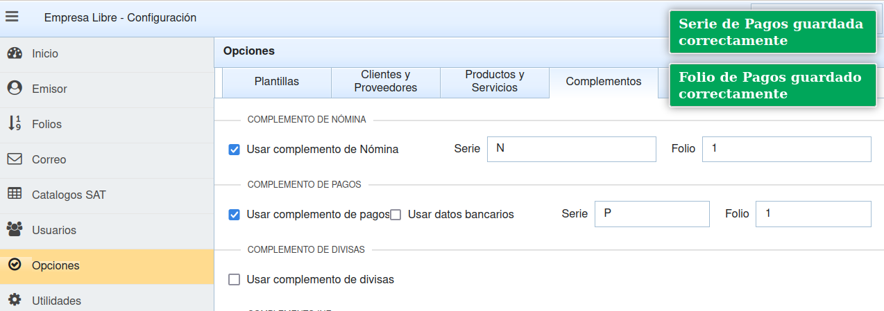 Ve al menu Opciones, ficha Complementos. Marca la casilla de verificación Usar complemento de pagos.