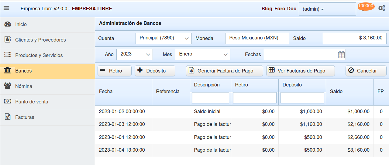 Selecciona un dep贸sito y da click en Generar Factura de Pago.