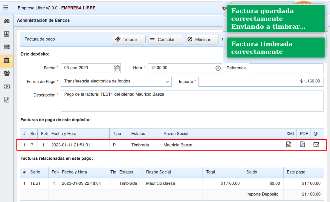 Si todo esta bien, el CFDI con Complemento de Pago ser谩 guardado e inmediatamente enviado a timbrar. Asegurate de ver las confirmaci贸nes respectivas en verde.